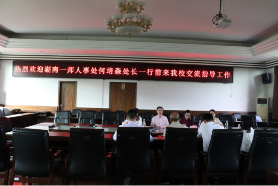 9月20日上午,何培森处长带领副处长巢卫平、陈奕,人事科科员王双利一行4人赴怀化学院考察学习交流。怀化学院人事处处长申桂荣、副处长杨庭业、科长俞建华、方淑春等热情接待了我处的考察人员。