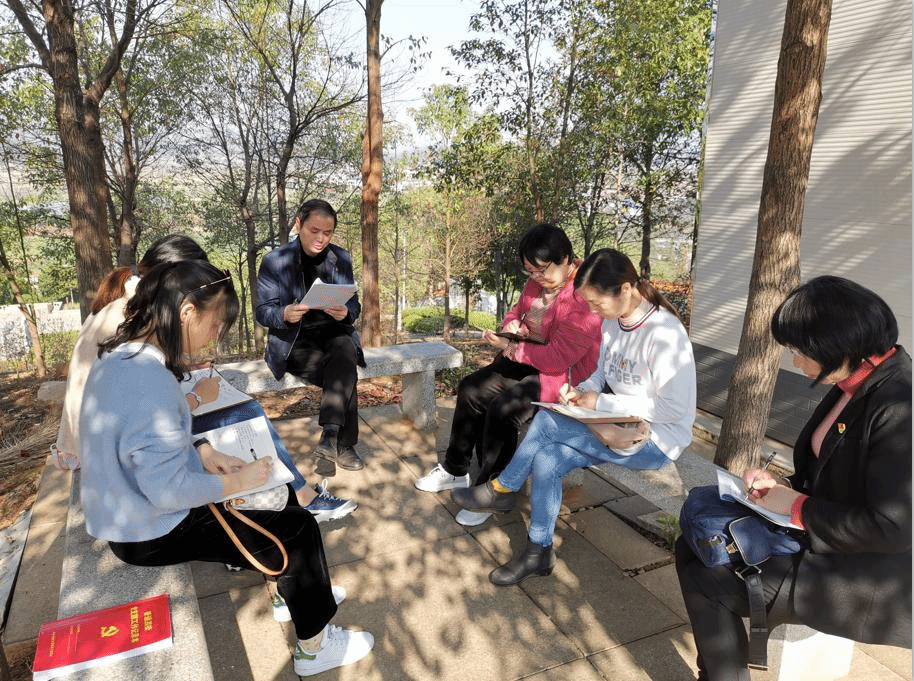 最后,人事处(教师工作部)党支部在铜像广场旁的石凳上,何培森书记为全体党员进行了“深入学习十九届四中全会精神”的主题党课。