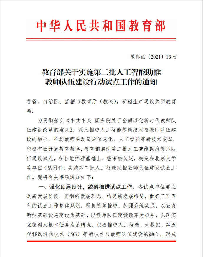 近日,教育部公布了第二批人工智能助推教师队伍建设试点单位名单,经单位申报、逐级推荐和专家评审,我校成功获批“教育部第二批人工智能助推教师队伍建设试点单位”。